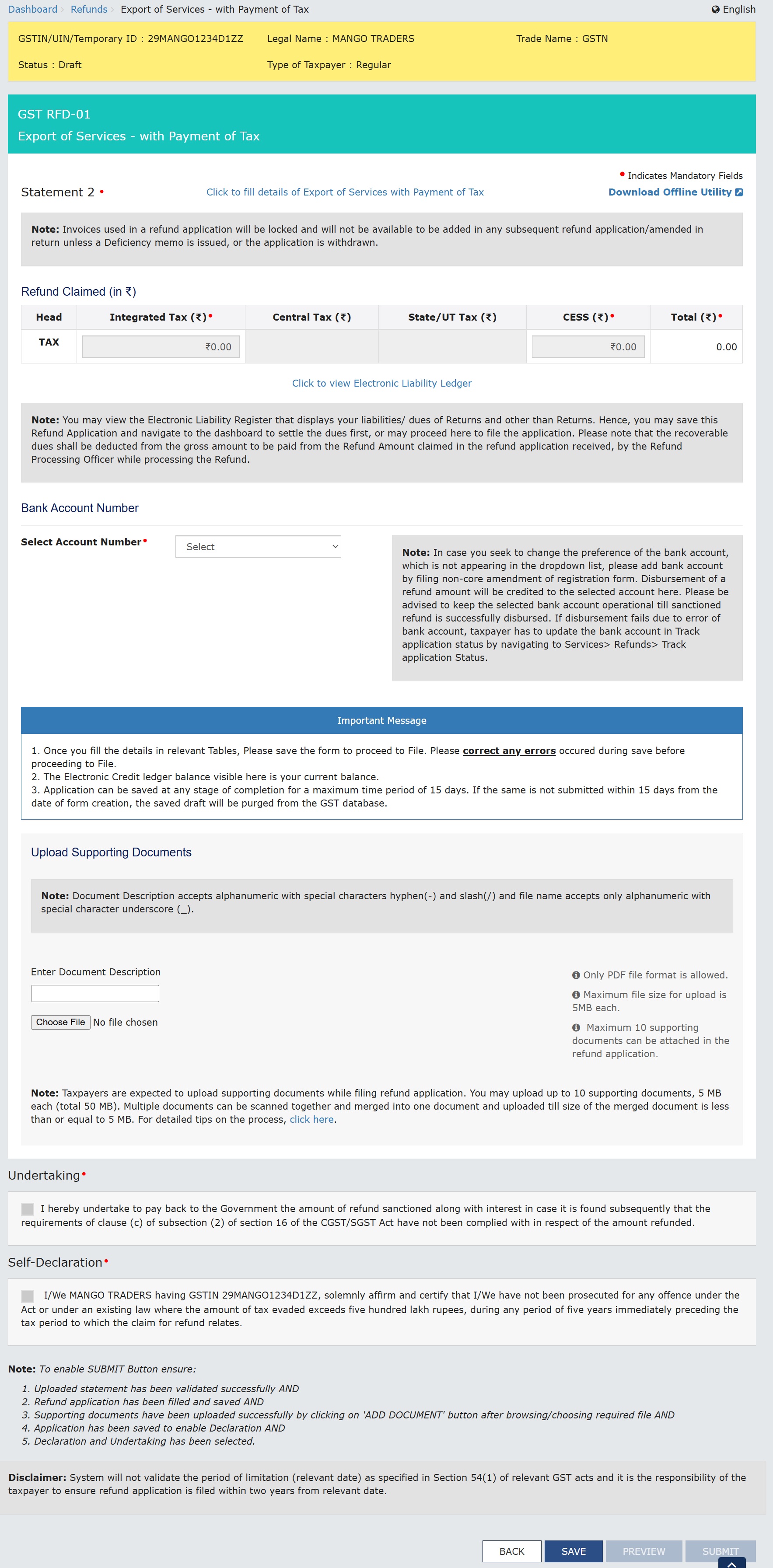 Export of Services -with Payment of Tax - To enter details for refund on account of export of services with Integrated Tax on the GST Portal