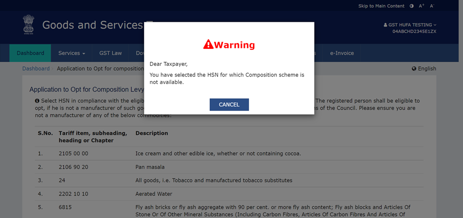 Note: If a normal taxpayer had entered HSN of any Goods or Service which is not eligible for Composition Levy while registering for GST and now wants to opt for the composition scheme, below warning message will pop-up. He/She will not be able to proceed further unless the commodity has been removed from the list of commodities.
